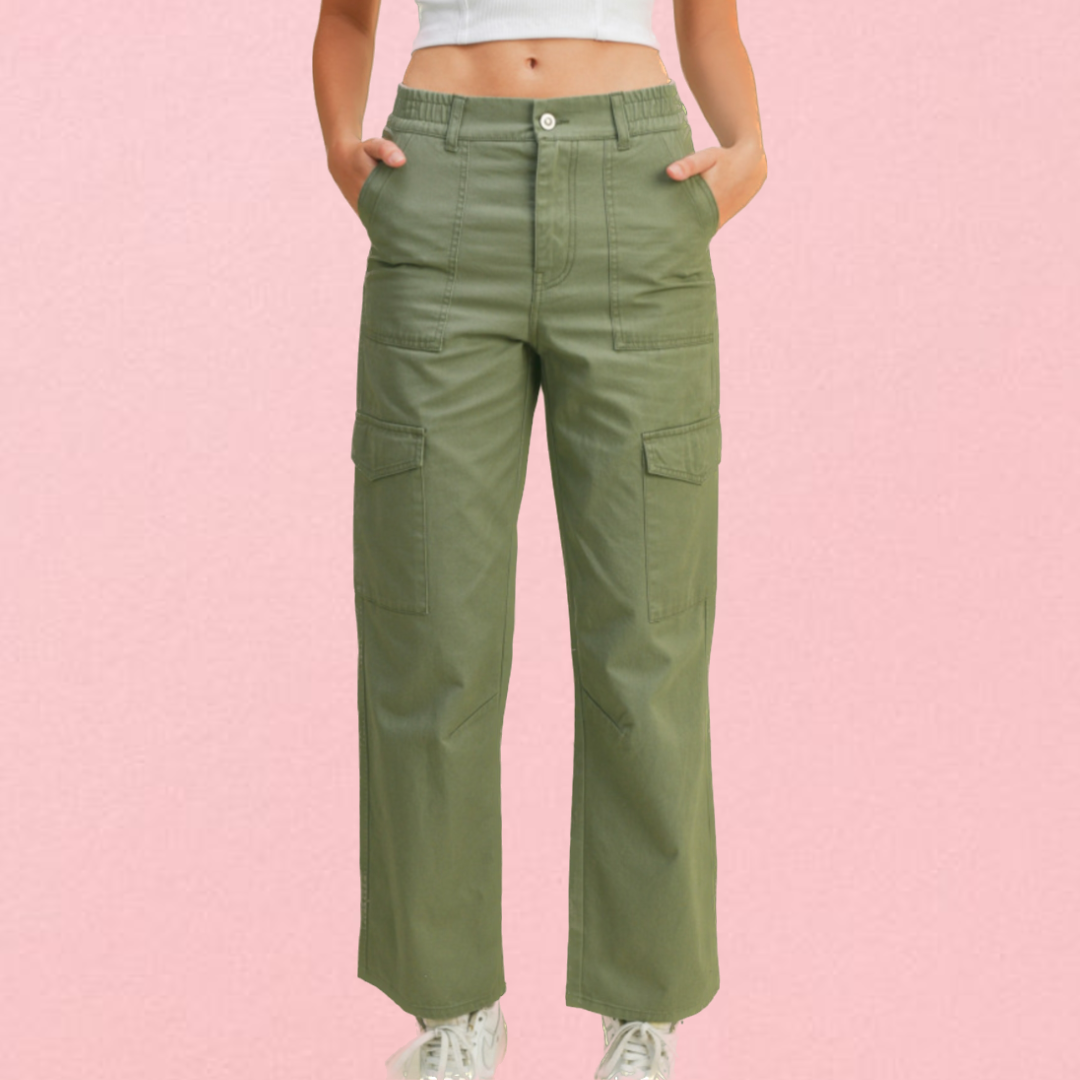 – A wide leg cargo pants in a cotton twill woven fabrication an elasticized back waist with a zip fly at front
