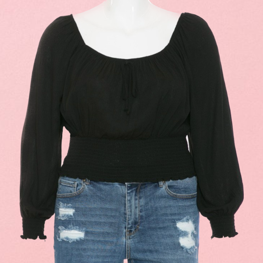 - A plus size square neckline smocked waist peasant top in a rayon gauze fabrication featuring balloon shape long sleeves.